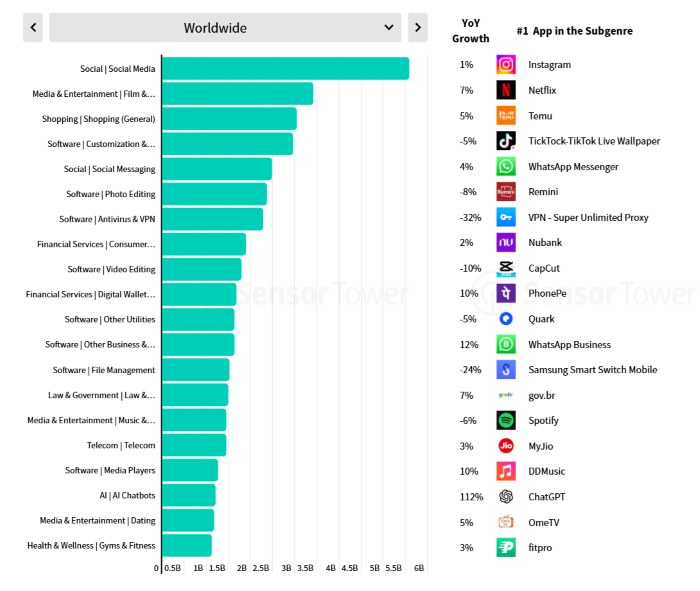 Ze zprávy, jež je založena na rozsáhlé analýze dat z iOS App Store a Google Play, vyplývá, že mezi nejstahovanější aplikace stále patří sociální sítě, dále streamovací aplikace a na třetím místě se umístily aplikace nákupní, kde je na špičce čínský ultra fast-fashion e-shop Temu. Největší meziroční nárůst však zaznamenaly aplikace s AI chatboty, u kterých proběhlo 635 milionů stažení.