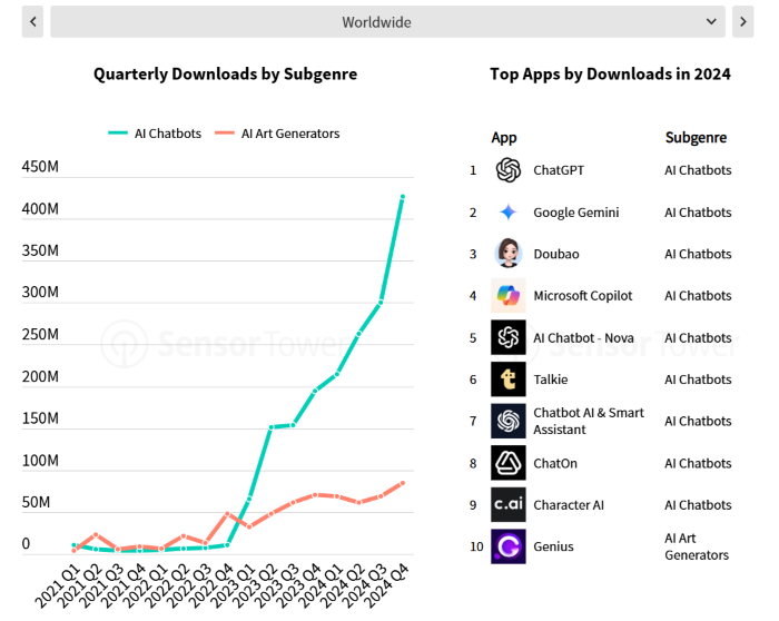Monetizovat se daří i aplikace umělé inteligence, kde nárůst příjmů z aplikací meziročně vzrostl o více než 200 % na 1,3 miliardu dolarů. Téměř polovina globálních příjmů přitom pochází z USA (45 %), s velkým odstupem poté z Velké Británie (4 %), Německa (4 %), Japonska (3 %) a Kanady (3 %). Nejstahovanější aplikací s AI je ChatGPT, která si zároveň ukrojila i 40 % z celkových tržeb, dále Google Gemini a Doubao od ByteDance.