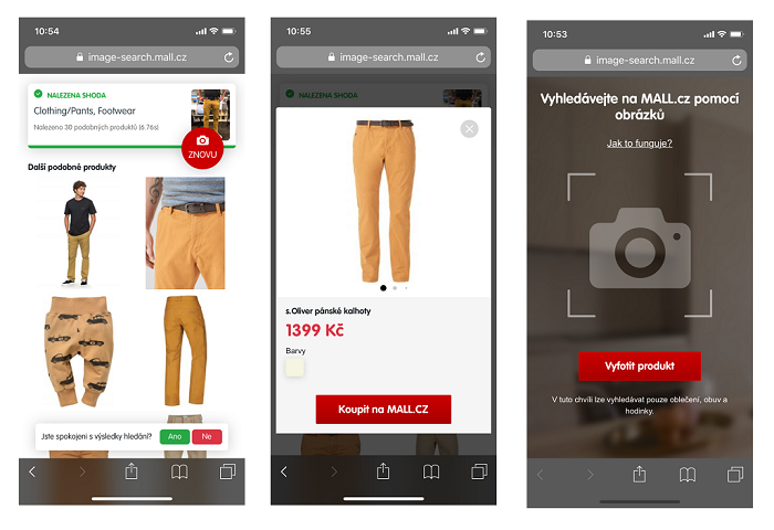 Mall.cz jako první český e-shop testuje vyhledávání podle fotek. Cílem je pomoci lidem co nejrychleji najít produkty z kategorie lifestyle. Služba podle libovolné fotografie z mobilního telefonu umí vyhledat nejpodobnější produkty, které je následně možné koupit na Mall.cz. Pilotní provoz funguje pro tři kategorie: módu, obuv a hodinky.