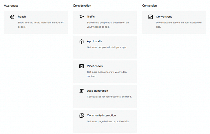 Cílem vaší existence na TikToku je budování své komunity kolem kanálu na jedné straně a současně ruku v ruce s tím zásah vaším sdělením na straně druhé. Z hlediska cílů reklamních kampaní máte na výběr z klasického zásahu relevantních uživatelů, přivedení uživatelů na váš web, zhlédnutí videa nebo výzvy k instalaci vaší aplikace.