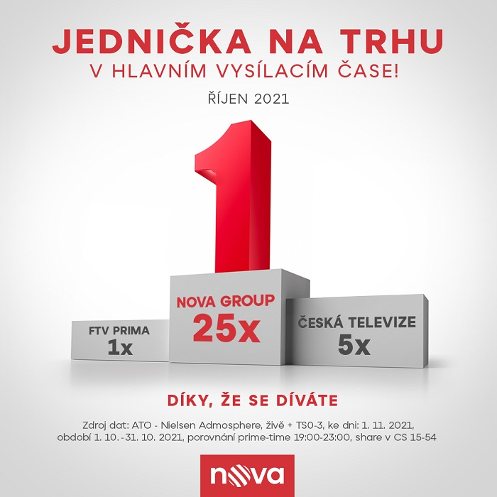 Skupina Nova s odvoláním na data oficiální sledovanosti Nielsen Admosphere oznámila, že během října oslovila v prime time (v CS 15-54) 35,39 % diváků u obrazovek a stala se 25krát lídrem v podílu na sledovanosti. Hlavní stanice Nova zvítězila v této divácké skupině v prime-time 26 večerů, informovala Nova.