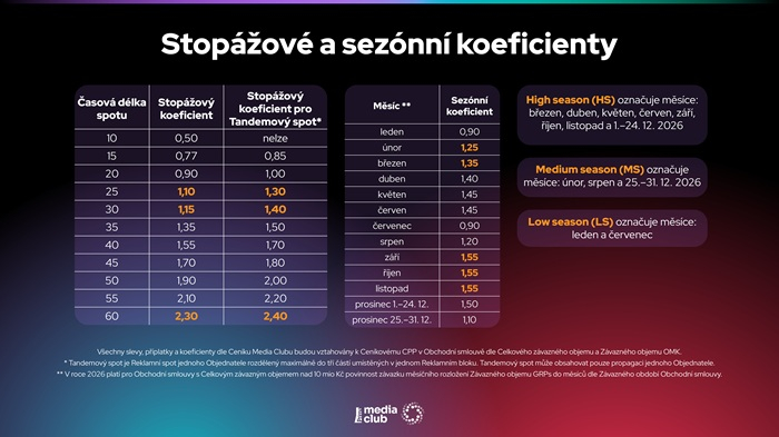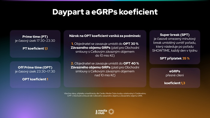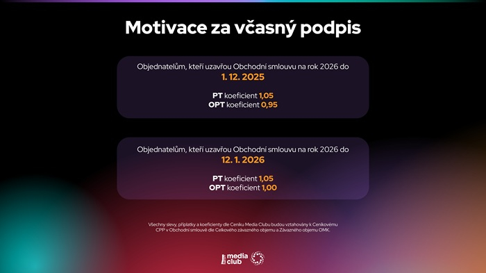 Media Club motivuje klienty k včasnému nákupu reklamy zvýhodněnými daypart koeficienty: při uzavření smlouvy do 1. prosince 2025 se koeficient pro off prime-time snižuje na 0,95 a pro prime-time na 1,05. Při podpisu do 12. ledna 2026 je pak off prime-time na úrovni 1 a prime-time na 1,05 (ceníkově off prime-time 1 a prime-time 1,1).