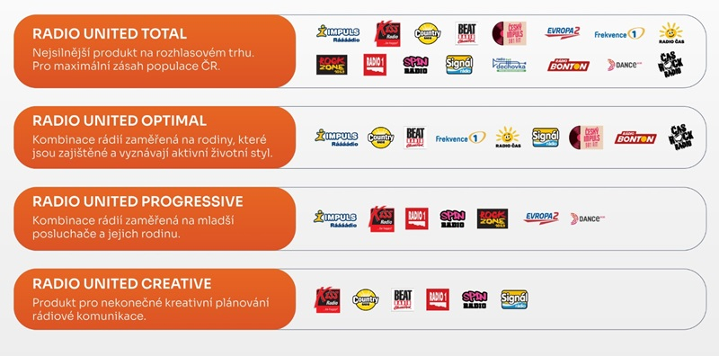 Obchodní balíčky nabízené klientům se pro rok 2025 nemění. Nadále jsou v nabídce čtyři varianty: Radio United Total, který zasáhne více dvě třetiny české populace, Radio United Optimal, zaměřující se na zajištěné rodiny, Radio United Progressive, cílící na mladší posluchače a jejich rodiny, a Radio United Creative je pak produktem pro kreativní plánování rádiové komunikace.