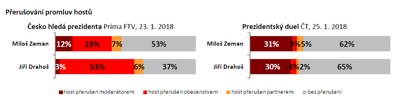 První přímá konfrontace obou prezidentských kandidátů, která se konala v úterý večer na TV Prima, byla charakteristická především intenzivním zasahováním publika do promluv obou hostů, a to nejčastěji při proslovech Jiřího Drahoše. Zatímco Miloš Zeman bez přerušení dokončil přibližně polovinu svých proslovů, u Drahoše se tak dělo v 37 % případů. Při čtvrtečním duelu na České televizi publikum do debaty téměř nezasahovalo a kandidáti tak zdárně dopověděli dvě třetiny svých replik. Vyplývá to z analýzy Media Tenor.