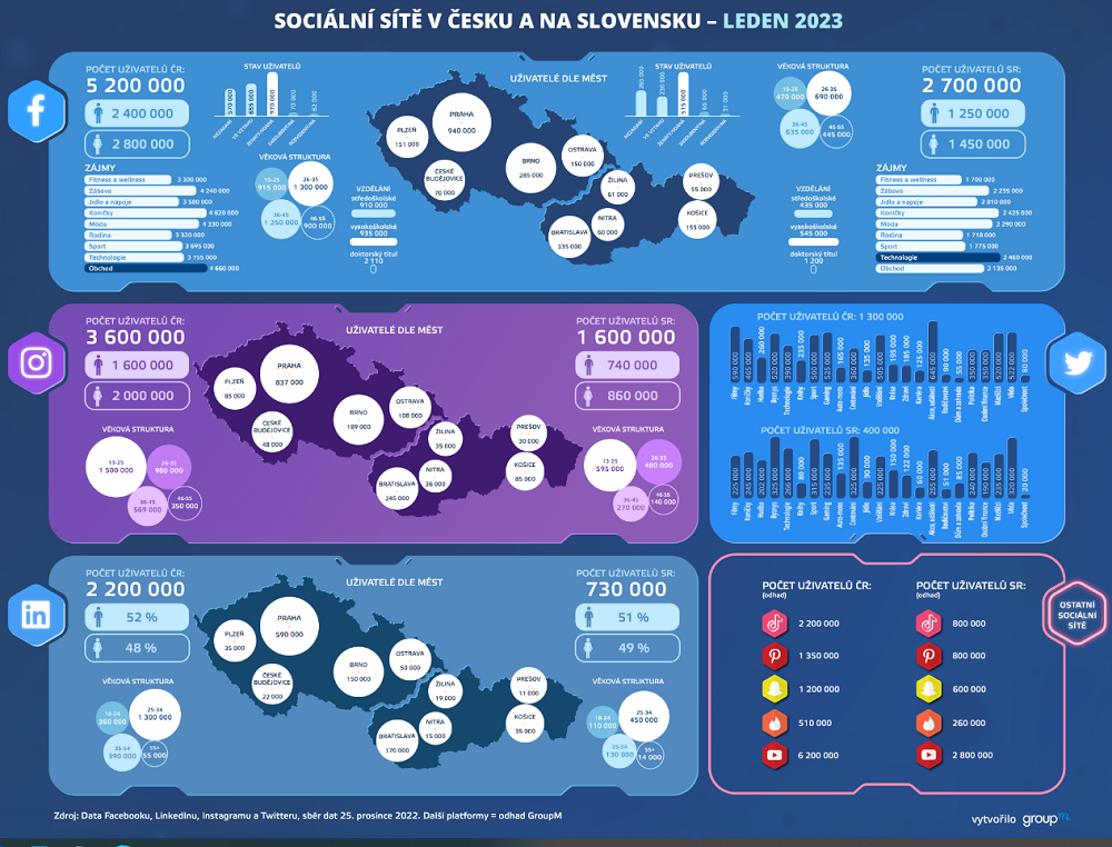 V roce 2023 se ještě více etabluje pozice TikToku a LinkedInu a s nástupem často zmiňované generace Z stále více uslyšíme o platformách typu Snapchat nebo Pinterest. Ostatně na Snapchatu je dnes drtivá většina českých uživatelů do věku 22 let.