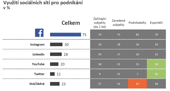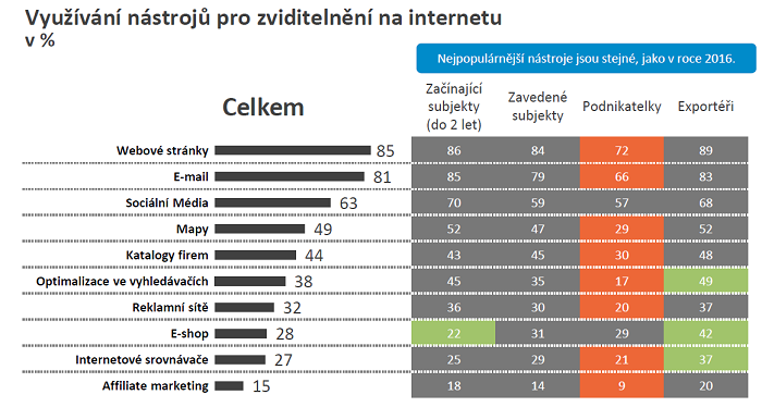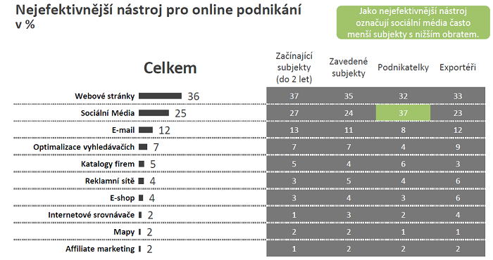 Sociální média jsou přitom vnímána jako druhý nejefektivnější nástroj po webových stránkách. Sociální média označují jako obzvláště užitečný nástroj podnikatelky. Výsledky a úspěšnost používání online nástrojů měří polovina podnikatelů, nejvíce tak činí exportéři.