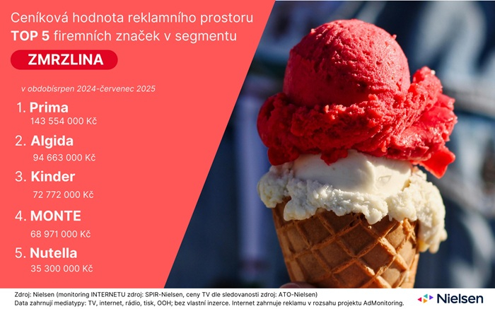 Monitoring reklamy Ad Intel výzkumné agentury Nielsen přináší tentokrát data z kategorie „zmrzlina" v období srpen 2024 až červenec 2025. Na prvním místě je česká značka zmrzlin Prima s poměrně velkým odstupem objemu investic v ceníkových cenách. Následuje Algida a na třetím místě najdeme značku Kinder. Žebříček TOP 5 uzavírají Monte a Nutella.