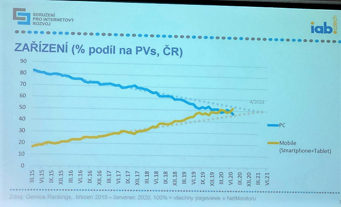 Z pohledu počtu zobrazených stránek (page views – PV) překonal počet zobrazených stránek z mobilních zařízení počet page views z desktopu. Stalo se tak dříve, než SPIR odhadoval (v grafu níže je šrafovanou čarou naznačena predikce, která předpokládala, že mobil předstihne desktop v počtu PV v dubnu 2021). Zvyšuje se také podíl mobilní reklamy na celkových reklamních investicích směřovaných do display reklamy. V současnosti je na úrovni 35 %. Jde ale o odhad před pandemií a je otázkou, zda bude naplněn. I tak je ale podíl mobilní reklamy na celkových display investicích ve srovnání se zahraničím nízký, zde se pohybuje kolem 49 %.
