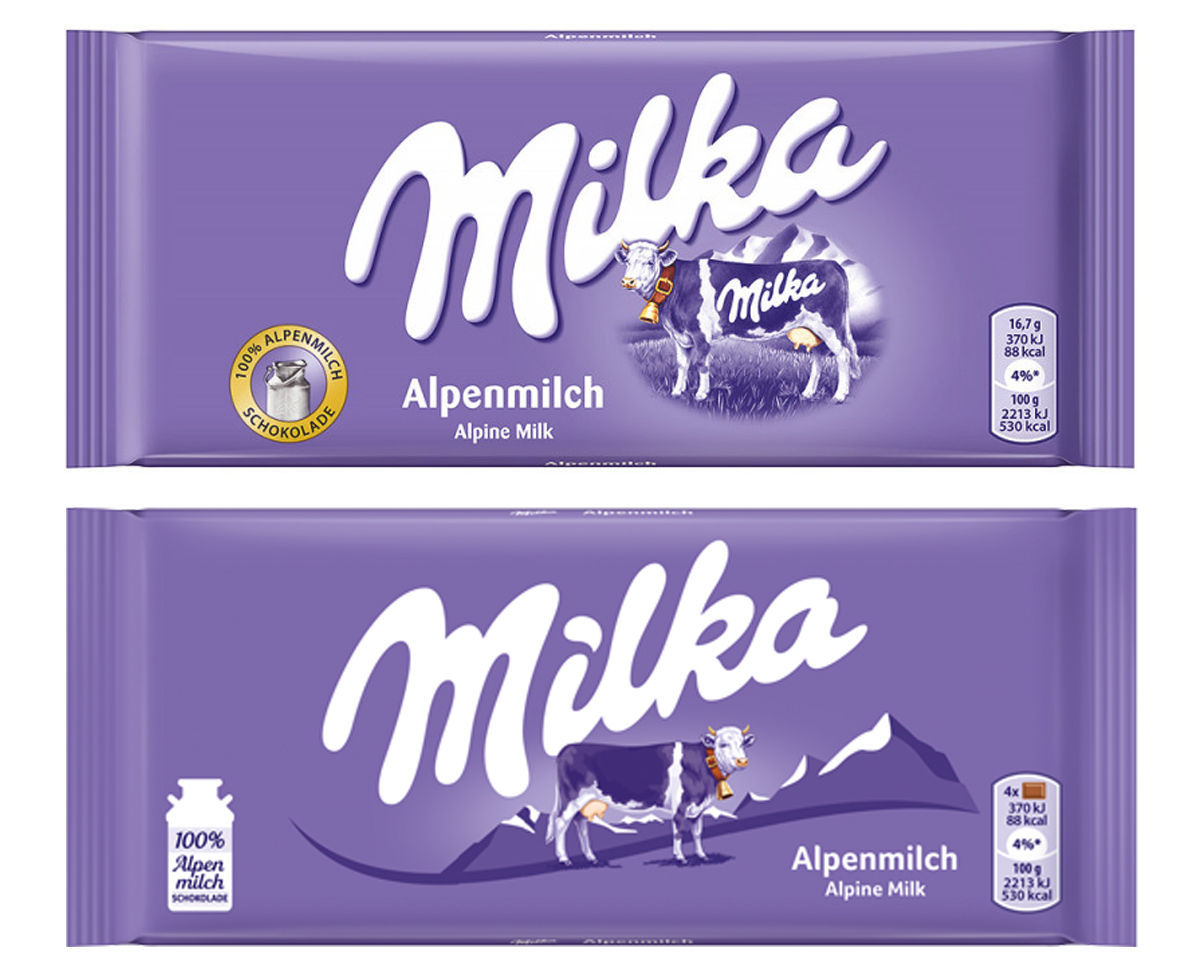 Změn doznal v novém logu samotný font, který se bez dosavadního stínování zploštil a jehož „tekutý dojem“ posílila tečka nad i ve tvaru kapky mléka. Výraznější změny se dotkly ikonické fialové krávy, která na obalech mění svou pozici i orientaci a již neponese na svém těle název Milka. Alpská krajina se nově rozprostře po celé šíři obalu. Nutriční hodnoty by měly být přehlednější a čitelnější.