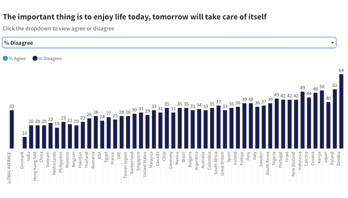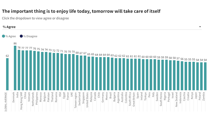 Dosáhnout generačních milníků, jako je nákup domu, svatba nebo založení rodiny, přijde mladé generaci natolik nemožné, že si raději užívá dneška a nechává, aby se zítřek o sebe postaral sám. S tímto tvrzení souhlasí v průměru napříč trhy 62 % dotázaných. Nejvíce je to viditelné v Dánsku (86 %), Indii 78 %, Hong Kongu, Číně a Vietnamu (77 %), v České republice si to myslí 55 % dotázaných.