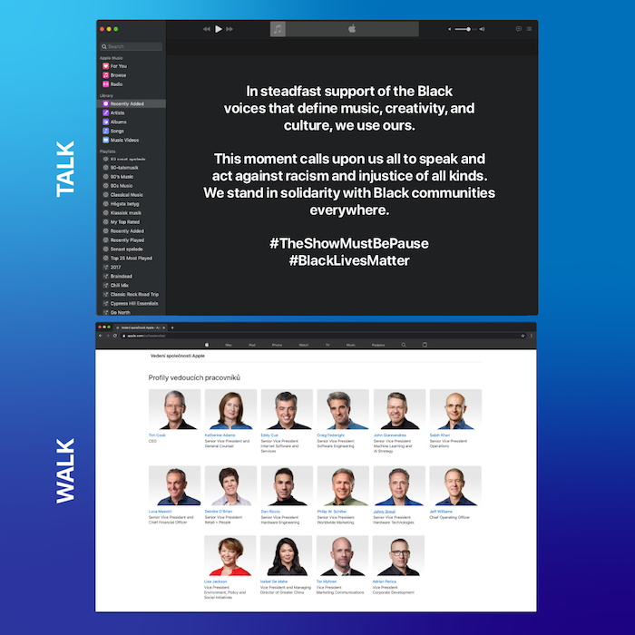 V souvislosti s posledním bodem by si někteří mohli vzpomenout na komentář Marka Ritsona, kde si rýpnul nejen do Applu a jeho boardu, který svým složením ne zrovna odpovídal tomu, za čím značka skrze své vyjádření stála. Totiž za solidaritou a podporou afroamerických komunit.