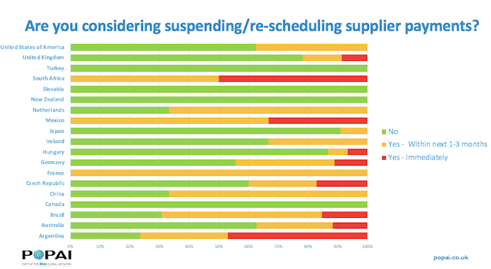 Až desetina firem ihned dodavatelům pozastavila či odložila platby, u nás to bylo dokonce 17 %. V globálním průměru se dalších 21 % k tomuto kroku chystá v příštích třech měsících, v Česku 23 %. U 12 % ještě není rozhodnuto, protože záleží na vládní či bankovní podpoře. Nicméně 42 % o pozastavení plateb ani neuvažuje, v České republice až 60 %.