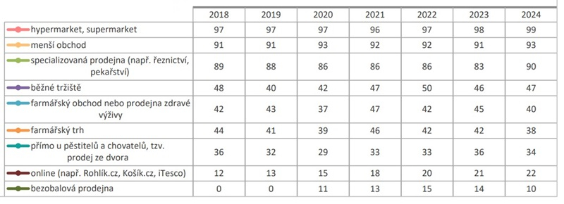 Z časového srovnání od roku 2018, vyplývá, že se od té doby návštěvnost hypermarketů a supermarketů, stejně jako menších a specializovaných obchodů nezměnila. Platí to i pro tržiště a rovněž i pro farmářské obchody nebo prodejny zdravé výživy. Zde se zájem o ně zvedl mezi lety 2018- 2021, od roku 2021 ale mírně klesá na původní hodnoty. Od roku 2021 se také mírně snižuje návštěvnost farmářských trhů. Nejviditelnější změny se týkají nakupování online, které se nejvíce zvýšilo mezi lety 2018 až 2021 a za posledních sedm let se pak téměř zdvojnásobilo.