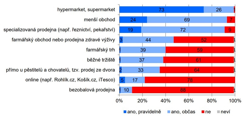 Nejčastějším místem pro nákup potravin jsou stále hypermarkety a supermarkety. Pravidelně zde nakupuje více než 70 % českých spotřebitelů. Čtvrtina (24 %) pak pravidelně využívá menší obchody a téměř 70 % do nich zajde občas. Podobné zvyklosti platí i pro specializované prodejny (pekařství, řeznictví atp.). Více než pětina (22 %) spotřebitelů nakupuje online, z toho 5 % pravidelně. Data přináší nová řada výzkumu CVVM.