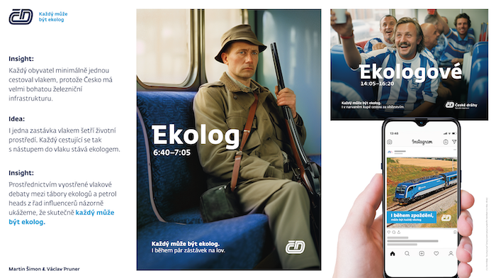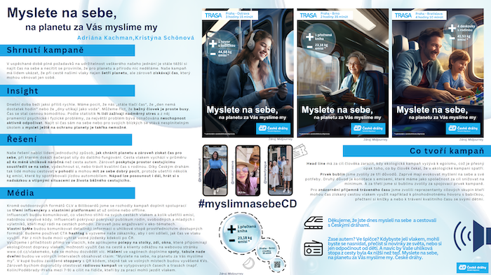 První místo obsadily Kristýna Schönová (Business Development Director) a Adriána Kachman (Junior Strategist) s konceptem „Myslete na sebe, na planetu za Vás myslíme my“. Podle porotkyně Radky Vlažné vítězný koncept dostál všem náležitostem briefu: „Výborně spojil benefit pohodlí ve dvou směrech – pohodlí jako možnost využití vlastního času při cestě vlakem a pohodlí ekologického chování, které vám zajistí již samotný výběr vlaku jako dopravního prostředku. Zároveň jsme ocenili vhodnost kampaně pro cílovou skupinu a bezproblémovou realizovatelnost konceptu.“ Vítězný tým postupuje do mezinárodní soutěže Creative Express pod hlavičkou ADC Europe.