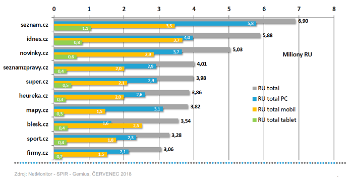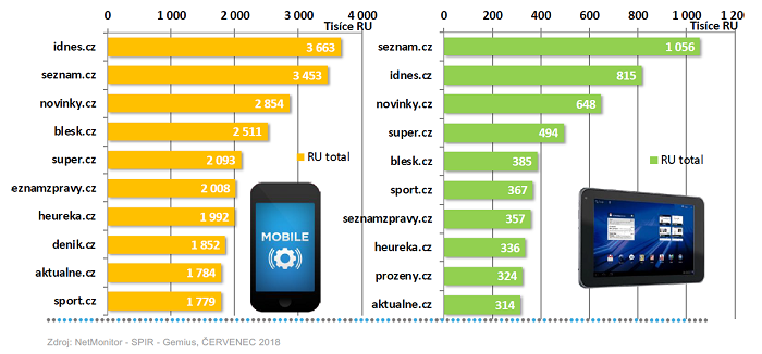 Největší počet uživatelů (RU) přichází z mobilních zařízení na servery iDnes.cz, Seznam.cz a Novinky.cz. Z tabletů je trojice stejná, jen pořadí je odlišné – Seznam.cz, iDnes.cz a Novinky.cz.