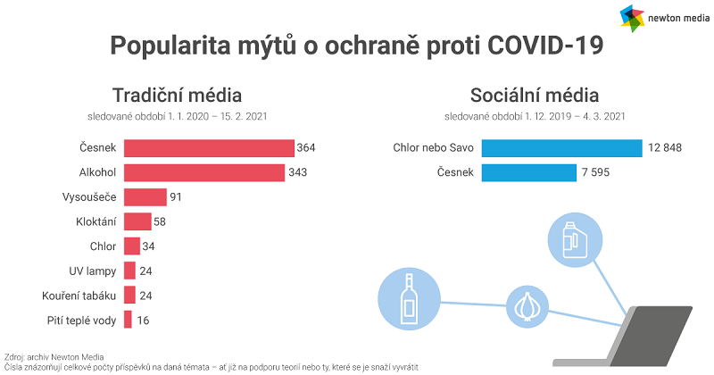 Za původem koronaviru stojí Bill Gates a šíří ho pomocí 5G sítí a před pandemií nás ochrání česnek či dokonce dezinfekce vpravená do žíly. I tak by se daly shrnout nejpopulárnější teorie o vzniku a šíření nemoci covid-19 a o možných způsobech, jak onemocnění čelit, které se objevují v českých médiích. Tyto teorie spojuje přesvědčení, že koronavirus byl uměle vytvořený nebo aspoň uměle rozšířený, aby určitým elitám umožnil ovládnout svět. Příspěvky, které se snaží konspirační lži a polopravdy veřejnosti odhalovat, však v médiích převažují nad těmi, které je šíří. Vyplývá to z analýzy společnosti Newton Media, která zmapovala nejčastější mýty týkající se covid-19.