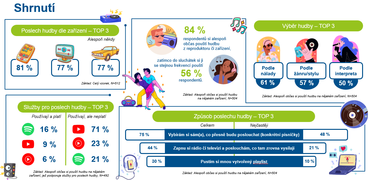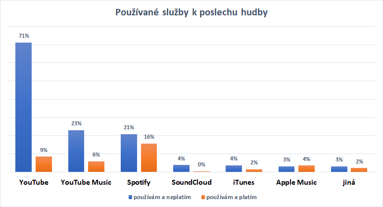 U neplaceného použití bezkonkurenčně vyniká YouTube, který používá k poslechu hudby 7 z 10 respondentů, následují YouTube Music (23 %) a Spotify (21 %). U placeného použití pak dominuje Spotify (16 %).