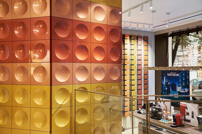 Nespresso otevřelo svůj zrenovovaný butik v Pařížské ulici v Praze, jenž je zároveň nejstarší z dnešních devíti poboček značky na českém trhu. Nová podoba odpovídá nákupnímu konceptu Celebrate the Coffee Moments, jež má návštěvníkům ukázat rituály ochutnávání kávy a nabídnout nejnovější designové stroje značky, doplňkové kolekce či limitované edice. Interiéru na první pohled dominuje designová stěna, jež se inspiruje ikonickými barevnými obklady stanic pražského metra A. K její výrobě bylo použito více než 400 kg hliníkových kapslí Nespresso. Stěna tak vzdává hold nejen recyklaci, ale i Praze.