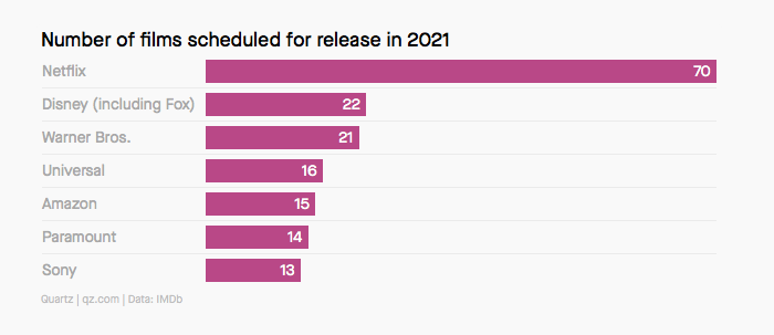 I z tohoto důvodu se například společnost WarnerMedia rozhodla, že všech svých 21 letošních filmů uvede simultánně jak v kamenném kině, tak na internetu prostřednictvím své služby HBO Max. Představí tak novinky jako Godzilla vs. Kong, Dunu nebo Matrix 4. V porovnání s ambiciózním plánem Netflixu se však jedná o značně nízký počet.