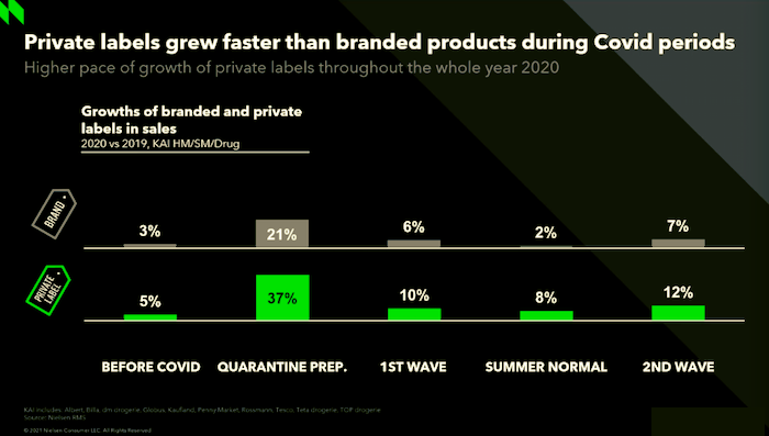 Privátním značkám pandemická situace nahrála. Jejich podíl na celkových tržbách se zvýšil z předloňských 20,9 % na loňských 21,5 %. Rostly během celého roku mnohem rychleji než značkové výrobky. Důvodem mohou být obavy Čechů z ekonomické situace a z toho plynoucí preference levnějších výrobků. Nejvíce se privátkám dařilo v potřebách na pečení, mléčných produktech a nealkoholických nápojích.
