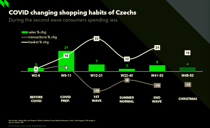 Z nárůstu nejvíce těžily potraviny (+ 6,4 %) a drogerie (+ 5,3 %). Naopak prodeje nepotravinových produktů se snížily o 1 %. Dařilo se čerstvým potravinám, které během první vlny rostly o 60 %, během druhé už jen o 26 %. Dále obecně vzrostly prodeje nápojů, suchých potravin a prostředků pro domácnost. Naopak na jaře znatelně poklesl zájem o impulzní kategorie, například o snacky, jejichž prodeje se během první vlny snížily o 10 %, během druhé vlny se však vrátily na stejnou úroveň jako v předcházejícím roce.