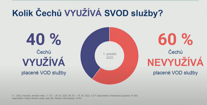 Placené video služby (SVOD) využívá podle nových dat Atmedia Indexu 40 % Čechů internetové populace ve věku 15-69. Ve srovnání s daty z loňského roku jde o nárůst o 12 procentních bodů. Data na středeční konferenci Digimedia 2022 prezentovala managing directorka Atmedia Michaela Suráková. Dodala, že z výzkumu zároveň vyplývá, že v dalších 12 měsících plánuje za VOD platit 42 % Čechů. V průměru si předplácejí 1,5 služby a platí za ně 205 Kč měsíčně.
