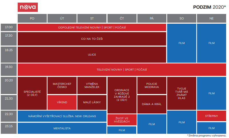 Kromě toho je nasazení pořadů Novy obvyklé: v pondělí pokračuje seriál Specialisté, ve středu půjdou reality show Výměna manželek a Malé lásky. Na sobotní večery Nova nasazuje nové díly reality show Tvoje tvář má známý hlas. Páteční večery jsou vyhrazeny reprízám seriálů Policie Modrava a Dáma a Král, nedělní filmům. V odpoledním a podvečerním vysílání pokračuje pořad Co na to Češi a seriál Ulice.