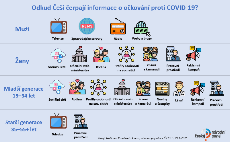 Čtvrtina Čechů čerpá informace na oficiálních stránkách ministerstva (27 %), mezi nimi jsou spíše mladí lidé ve věku 15–24 let, a také vysokoškoláci; podobný počet lidí se pak pro informace ohledně očkování obrací na svou rodinu a informují se u svých nejbližších (25 %). U svých rodinných příslušníků se informují spíše ženy a lidé do 34 let. O něco méně dotazovaných získává informace z rádia (23 %), posluchači, kteří v rádiu tyto informace hledají, jsou převážně muži.