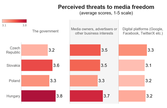Ohrožení mediální svobody vnímají Češi nejvíce ze strany mediálních vlastníků a zadavatelů, poté ze strany digitálních platforem (Google, Facebook, X) a o něco méně ze strany vlády (viz graf níže). Naopak Maďaři a Slováci považují vládu za nejvyšší ohrožení pro svobodu médií.