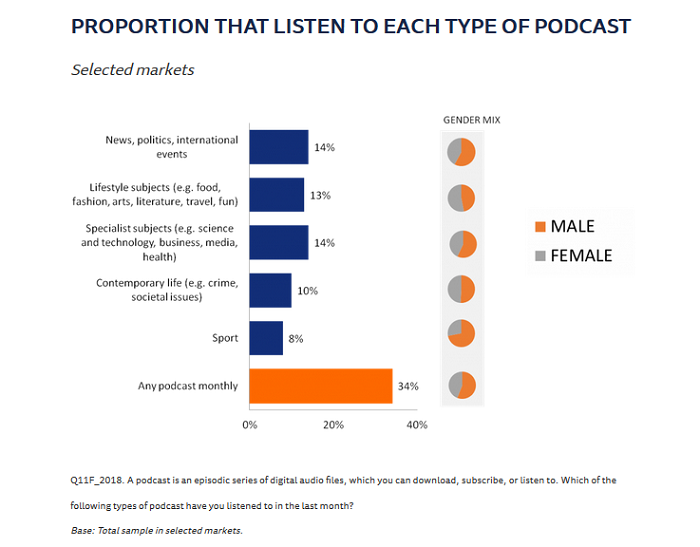 Podcasty jsou obecně oblíbenější u mladší generace. Podle údajů již zmíněného Digital News report je alespoň jednou za měsíc poslouchá 48 % populace ve věku od 18 do 34 let, ve skupině 55+ je to ale jen 22 %. A lidé zdaleka neposlouchají jen zpravodajství. Svou pozornost věnují i pořadům o vědě, technologii, byznysu, médiích nebo zdraví a také lifestylovým tématům, jako je móda, umění nebo jídlo.