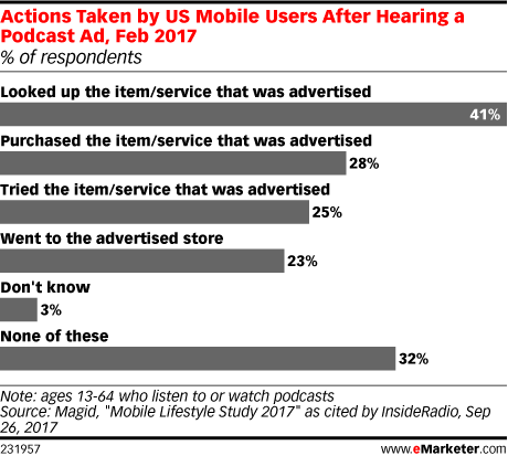 Vedle toho vykazuje reklama v podcastech podle průzkumu Mobile Lifestyle Study vysoké výkonnosti. Až 41 % posluchačů si po vyslechnutí reklamního sdělení vyhledalo propagovaný produkt nebo službu, a 28 % dokonce přistoupilo ke koupi.