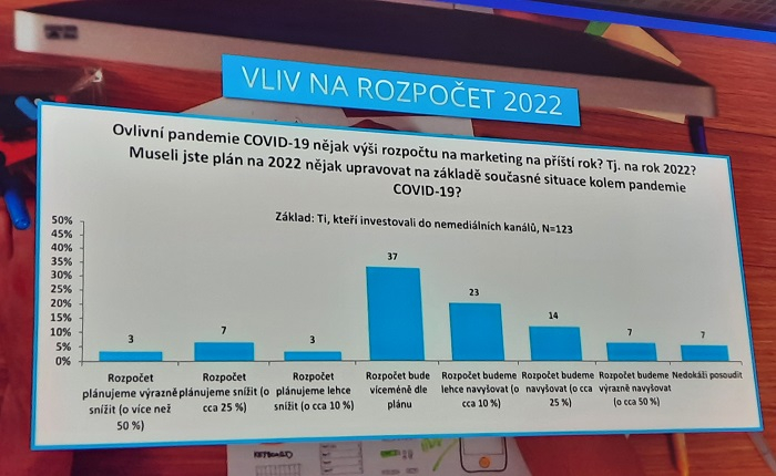 Stabilitu marketingových investic a jejich zvyšování potvrzují i výhledy marketérů (cca 120 oslovených) pro rok 2022. Ti, kteří investují do nemediálních kanálů, nejčastěji do výzkumu uvedli (37 %), že rozpočet pro příští rok bude odpovídat plánovaným investicím. Lehké navyšování rozpočtu (o cca 10 %) předpokládá téměř čtvrtina marketérů (23 %) a navyšování o 25 % a o 50 % odhaduje dohromady 21 % marketérů.