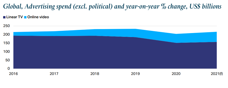 Globální investice směřované do reklamy v lineární televizi se celkově za posledních pět let snížily, lineární televize ale stále zůstává celosvětově hlavním reklamním nosičem, pokud se zohlední i další video formáty. Její podíl představuje 75 %.