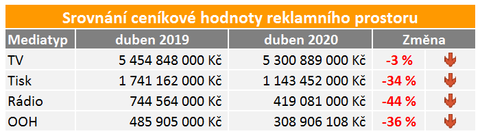 Objem monitorovaných reklamních investic v médiích v letošním květnu se obdobně jako v dubnu vlivem pandemie koronaviru výrazně snížil. V průměru byl meziročně nižší o více než pětinu (-22 %). Nejcitelněji byla v květnu poznamenána venkovní reklama, která se meziročně snížila téměř o polovinu. Ukazuje to monitoring společnosti Nielsen Admosphere.