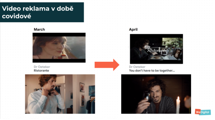 Podobného efektu můžete dosáhnout i v době covidové. Svoji reklamu můžete uzpůsobit současné situaci. Když se lidé nemohou potkávat tak, jak byli dříve zvyklí, upravte své příběhy, které je k setkávání vyzývali a ukažte svůj výrobek v novém světle – jako se skvěle povedlo Ristorante v ukázce níže. Můžete lidem dát, to co očekávají. Ukázku toho, jak jim v současné situaci umíte pomoci, co pro ně udělat. Můžete nabídnout ujištění, odlehčit situaci humorem, vyzvat je k nějaké akci – prostě ukázat, že žijete s nimi. Kde jinde se vám to povede lépe než v krátké on-line reklamě.