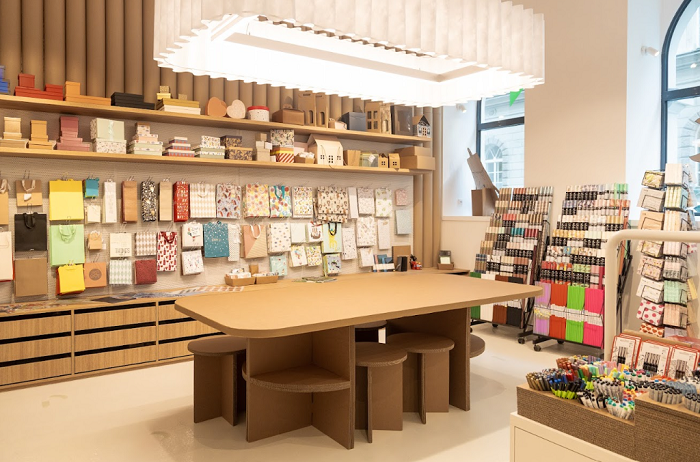 S materiálem a motivem papíru pracuje prodejna i v samotném prostoru. Kartonové tubusy na stěnách doplnily závěsná tělesa z kartonu od designérek Natalie Costantinové a Anety Honzové. Tyveková světla a mačkaná stěna mají připomínat strukturu papíru a část nábytku vznikne přímo ve výrobě Plojhar z kartonu. „Hlavním nosným prvkem interiéru je prostá, ale v uspořádání zajímavá nástěnná instalace z kartonových tubusů. Celý interiér bude velmi vzdušný, čistý, spojený přírodními barvami a materiály, přitom velmi nadčasový,“ popisuje Anna Teresa Hamerská, druhá ze zakladatelek Atelier Monday.