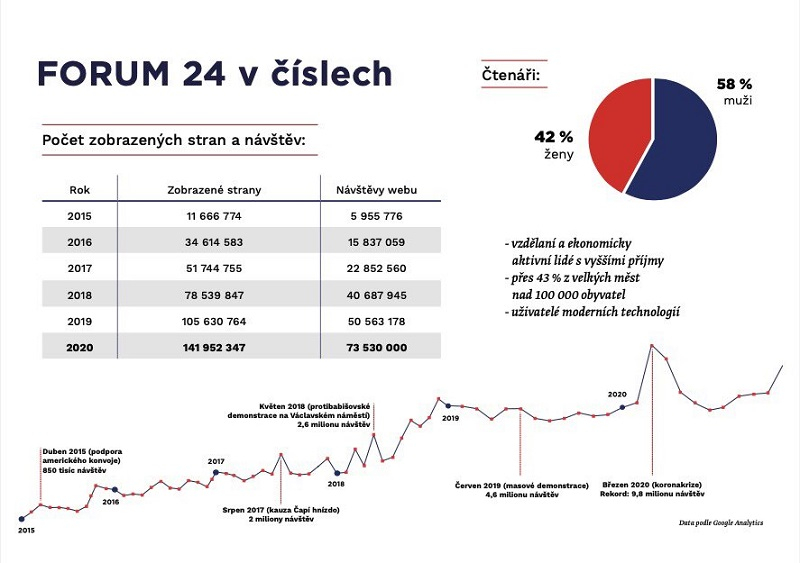 Průměrná měsíční návštěvnost webu Forum 24 dosáhla v loňském roce 1,4 mil. reálných uživatelů a ve srovnání s rokem 2019 se zvýšila o 32 %. Vyplývá to z dat jednotného měření internetové návštěvnosti NetMonitor. I v loňském roce tak web pokračoval ve zvyšování své návštěvnosti.