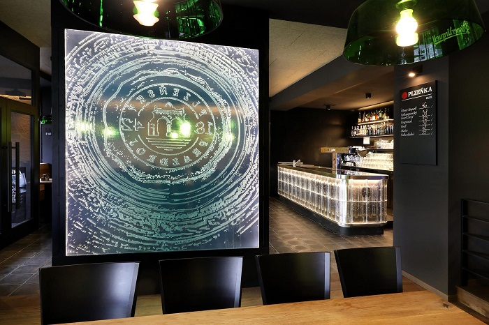 Dominantou celé hospody je výčep, vyrobený je ze skleněných kachlů a inspirovaný plzeňským pivním půllitrem. Dělícím prvkem hospody je velká skleněná pečeť charakteristická pro plzeňský ležák, která je zároveň i symbolem Plzeňky. Skleněné dekorace jsou dílem sklářů ze sklárny Bomma ve Světlé nad Sázavou. Sklo má charakterizovat základní myšlenku propojení pivovarského a sklářského řemesla jako dvou odvětví s bohatou tradicí a vynikajícím zvukem v celém světě.