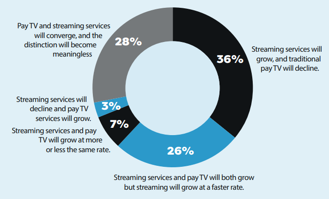Asi nejzajímavější názor z průzkumu říká, že bude docházet ke sbližování tradiční placené TV a streamu. Podle 28 % dotázaných dokonce zmizí rozlišování mezi oběma službami. Dalších 26 % pak očekává, že streamovací služby i placená televize porostou i nadále samostatně, přičemž streamovací služby porostou rychleji. 36 % pak očekává růst streamovacích služeb na straně jedné a pokles lineární televize na straně druhé.