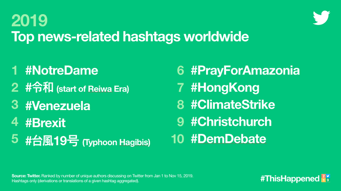 Na blogu Twitteru nechybí ani přehled nejpopulárnějšího obsahu podle jednotlivých kategorií. Zatímco Google se začal ještě více profilovat jako nákupní platformy mimo jiné pomocí výše uvedených statistik nejhledanějších produktů, Twitter má pro změnu blíže ke zpravodajství. Nechybí proto ani kategorie nejpoužívanějších hashtagů spjatých se světovým děním.