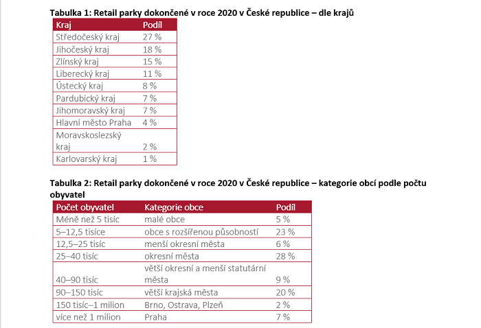 V minulém roce bylo podle analýzy realitně poradenské společnosti Cushman & Wakefield v České republice dokončeno či rozšířeno 23 projektů nákupních parků (neboli retail parků - RP) s celkovou obchodní plochou téměř 55 tisíc metrů čtverečních, jejich výstavba byla navíc loni nad desetiletým průměrem. Souhrnná plocha všech retail parků v Česku tak překročila hranici milionu čtverečních metrů (nezapočítává se plocha super nebo hypermarketů, pokud jsou součástí projektu). Jejich výstavba se nyní zaměřuje především na menší města do 40 tisíc obyvatel, nejvíce se loni stavělo ve Středočeském kraji.