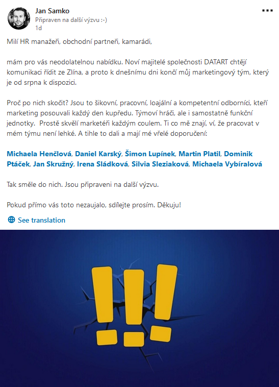 Po spojení se skupinou HP Tronic se společnost Datart rozhodla řídit svou marketingovou komunikaci ze Zlína. Z tohoto důvodu také k poslednímu červenci propustila svůj dosavadní marketingový tým, v jehož čele stál poslední tři roky Jan Samko. Ten také o celém kroku informoval na profesní síti LinkedIn, kde své marketéry „nabízí k dispozici“.