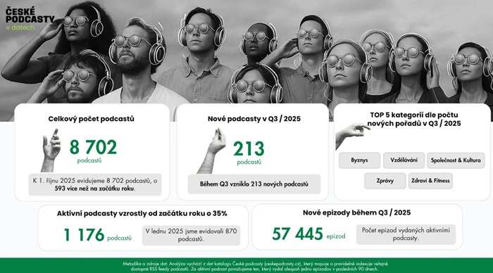 V Česku stále roste popularita podcastů. Platforma České podcasty k 1. říjnu evidovala celkem 8702 podcastových pořadů, což představuje nárůst o 7,3 % ve srovnání se začátkem letošního roku. Aktivních podcastů, tedy těch, které vydaly alespoň jednu epizodu za posledních 90 dní, je rekordních 1176. Za třetí čtvrtletí letošního roku přibylo celkem 213 nových titulů, nejčastěji v kategoriích byznys, vzdělávání, společnost, kultura, zdraví a zpravodajství. Mezi novinkami jsou jen v jednotkách zastoupeny true crime podcasty, ačkoliv patří k nejpopulárnějším v Česku. Trendem jsou pak živá setkání.