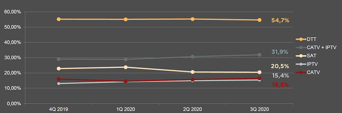 Jak vyplývá z grafu níže, pozemní digitální vysílání využívá pro příjem TV signálu 54,7 % populace ČR. V čase mírně klesá satelitní platforma (20,5 %), naopak se zvyšuje kabelové (16,5 %) a IPTV vysílání (15,4 %).