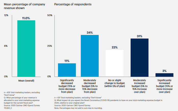 Téměř polovina marketérů (45 %) očekává v důsledku pandemie snížení marketingového rozpočtu, z toho 11 % předpokládá, že půjde o snížení výrazné. Naopak 34 % dotázaných si myslí, že se jejich rozpočet navýší.