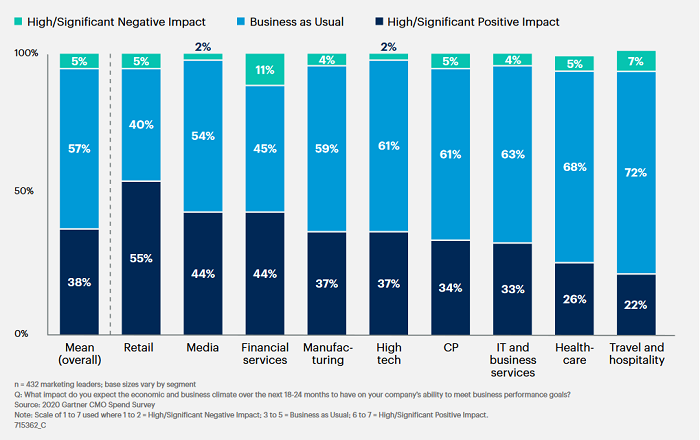 Pandemie koronaviru výrazně zasáhla i marketingové odvětví. V mnohých firmách se musely zrušit či pozastavit kampaně, ušetřeny nebyly ani rozpočty. Téměř tři čtvrtiny marketérů (73 %) se však domnívá, že negativní vliv bude mít Covid-19 na jejich oblast jen krátkodobě. Vyplývá to z aktuálního průzkumu společnosti Gartner, kterého se zúčastnilo přes 430 marketérů ze Severní Ameriky, Velké Británie, Francie a Německa.
