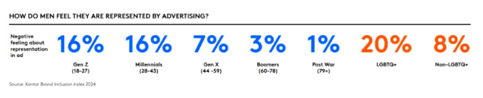 Stereotypní zobrazování muže v komunikaci proto mnohé spotřebitele odrazuje. Až 16 % zástupců generace Z a mileniálů vnímá mužské vyobrazení v reklamě negativně, u generace X je to 7 %, u Boomers jen 3 %. U LGBTQ+ komunity je to více než dvojnásobek (20 %) než u heterosexuální většiny (8 %). Tento podíl roste u mužů s mentálním postižením či poruchami učení (30 %), s psychickými problémy (20 %) či jakýmkoliv jiným postižením (16 %).
