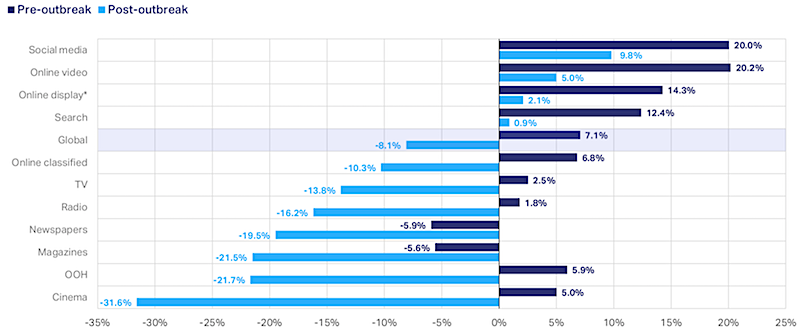Pokles reklamních investic v důsledku dopadů pandemie Covid-19 pocítí podle nového odhadu Warc především tradiční offlinová média. Objem investic se má v jejich případě celosvětově snížit o 16,3 %. Nejvíce si mají pohoršit kina (-31,6 %), venkovní reklama (-21,7 %), dále pak tištěná média (-20,1 %), rádio (-16,2 %) a nejméně má dopady pocítit televizní reklama (-13,8 %).
