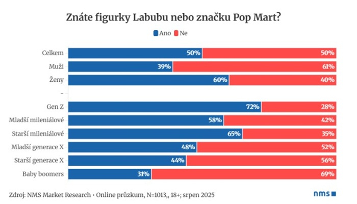 Podle srpnového průzkumu agentury NMS zná fenomén figurek Labubu v Česku každý druhý člověk. Nejvyšší povědomí vykazuje generace Z, kde jej uvádí 72 % dotázaných, ale relativně dobře je značka známá i mezi staršími generacemi. U lidí ve věku 53–60 let ji zná 44 % a mezi baby boomers 31 %. Výrazné rozdíly se objevují mezi pohlavími: povědomí o Labubu má 60 % žen oproti 39 % mužů.